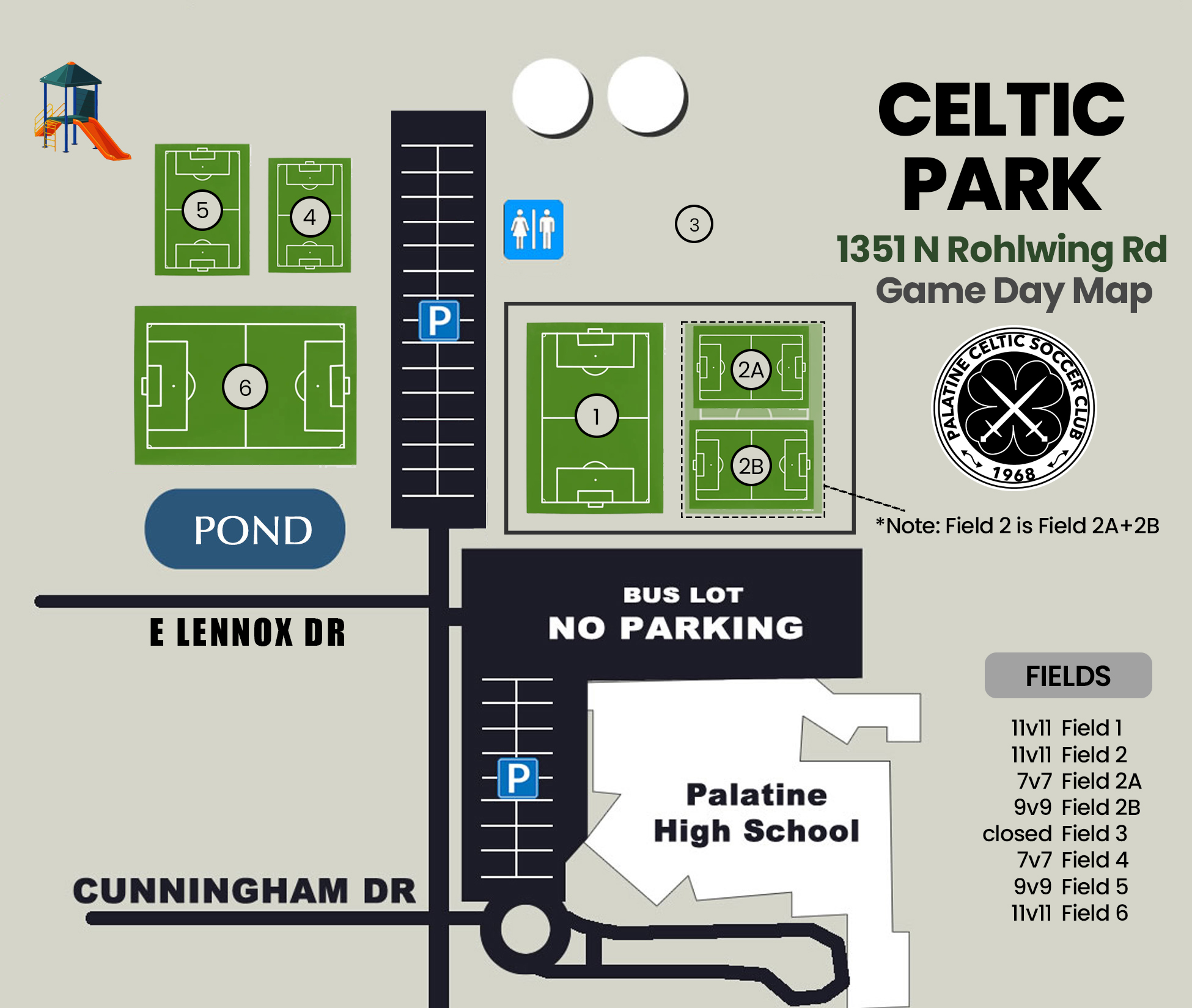 Our facilities are some of the best fields in the Northwest suburbs of Chicago. Our main home is Celtic Park, boasting two lighted 11v11 turf fields plus another lighted grass field. An additional 11v11 grass field is across the parking lot as well as 2 small-sided fields. Celtic's other large complex, Ron Gbur Park (formerly Hamilton Park) has six 11v11 field with 4 fields with lights. The Palatine Park District maintains our fields and they are some of the best in the business when it comes to getting them ready each season.